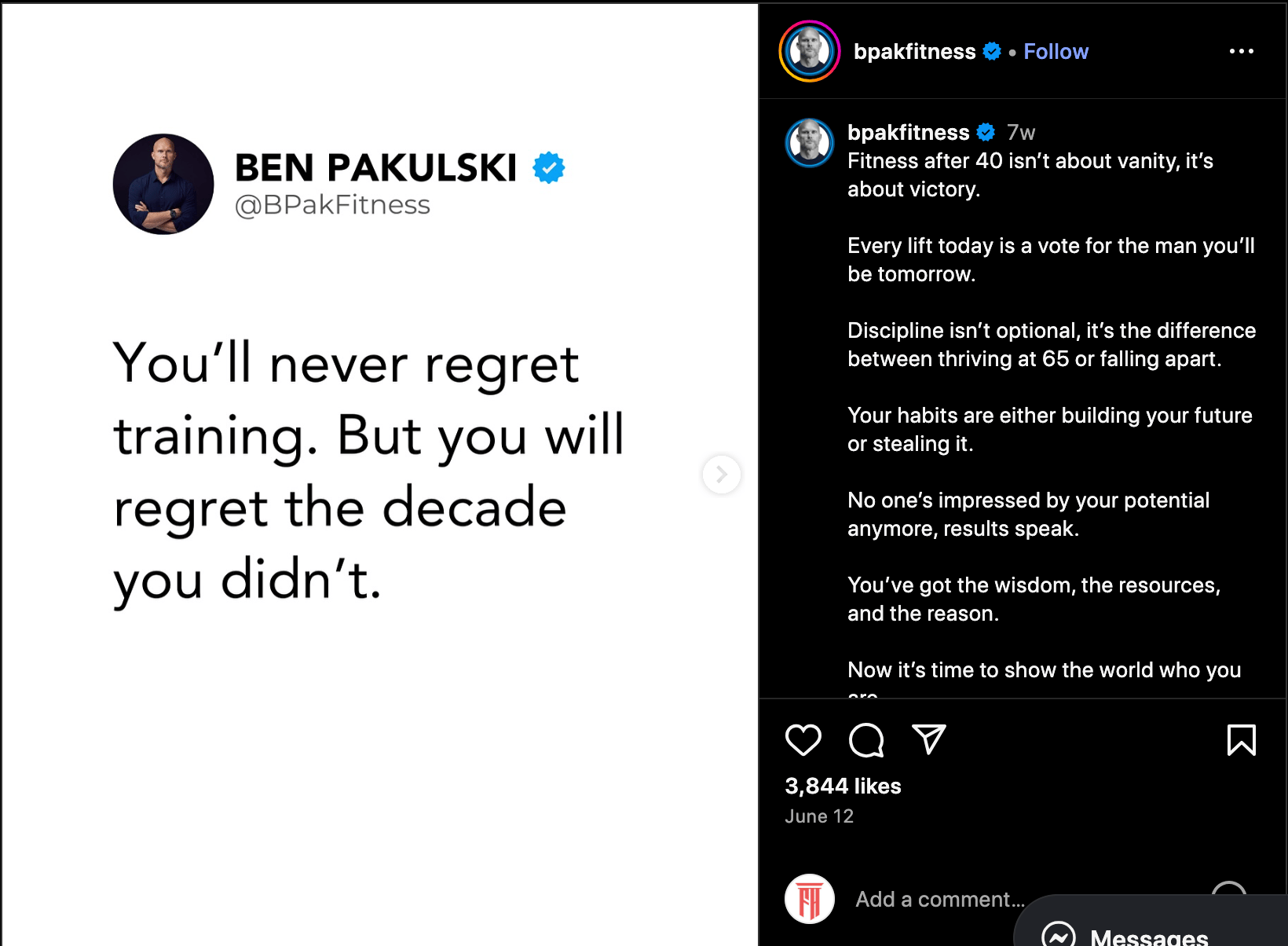 Pakulski’s quote cuts deep: “You’ll never regret training. But you will regret the decade you didn’t.” He reminds us that missed consistency costs more than missed workouts. Every session is a vote for your future self.